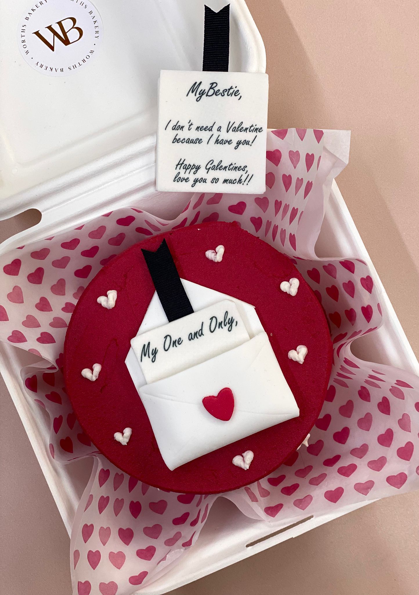 Make a heartfelt statement with our Love Letter Mini cake— a beautifully crafted dessert designed to celebrate love. Decorated with a white fondant envelope, gently opened to reveal a handwritten-style message that reads your own personalised message. A delicate red heart seal and mini heart details add a romantic finishing touch.