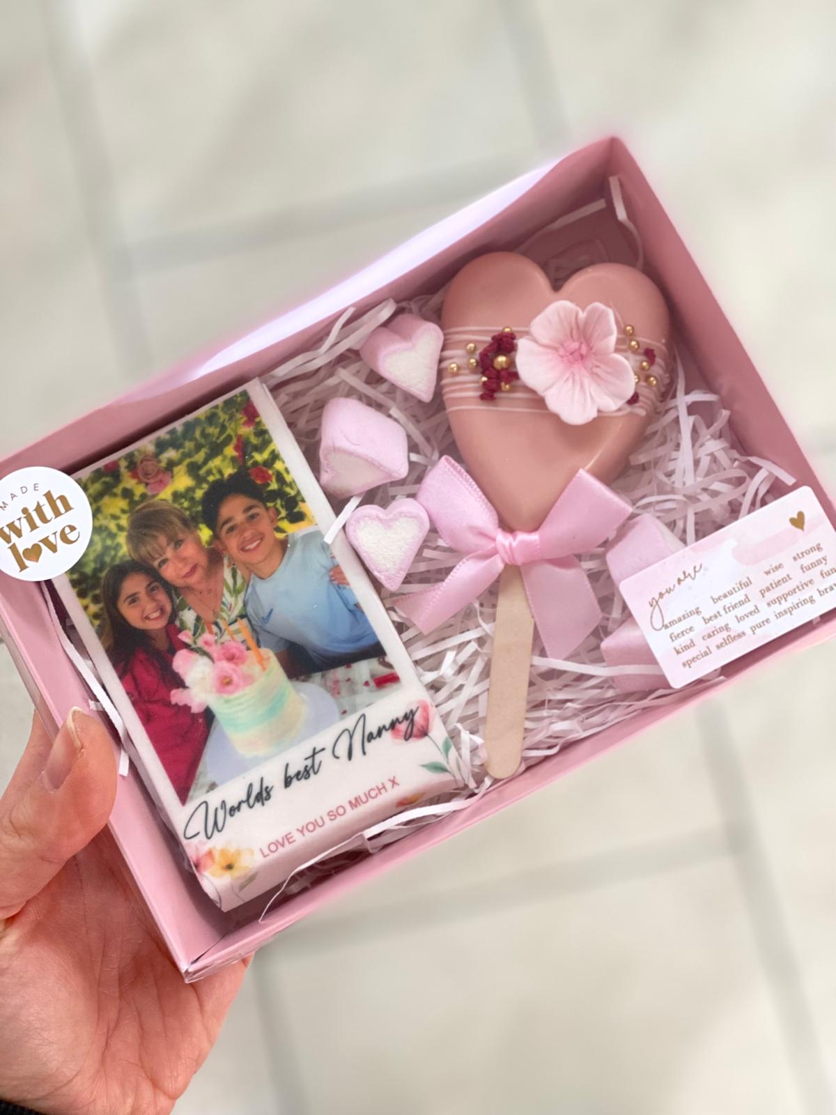 Each box contains one handmade vanilla cakesicle, a luxury iced shortbread biscuit with a photo of your choice, a grazing of mallows and meringues to match the colour scheme.Simply send your photo to 07725884034 along with your full name immediately once placing your order.