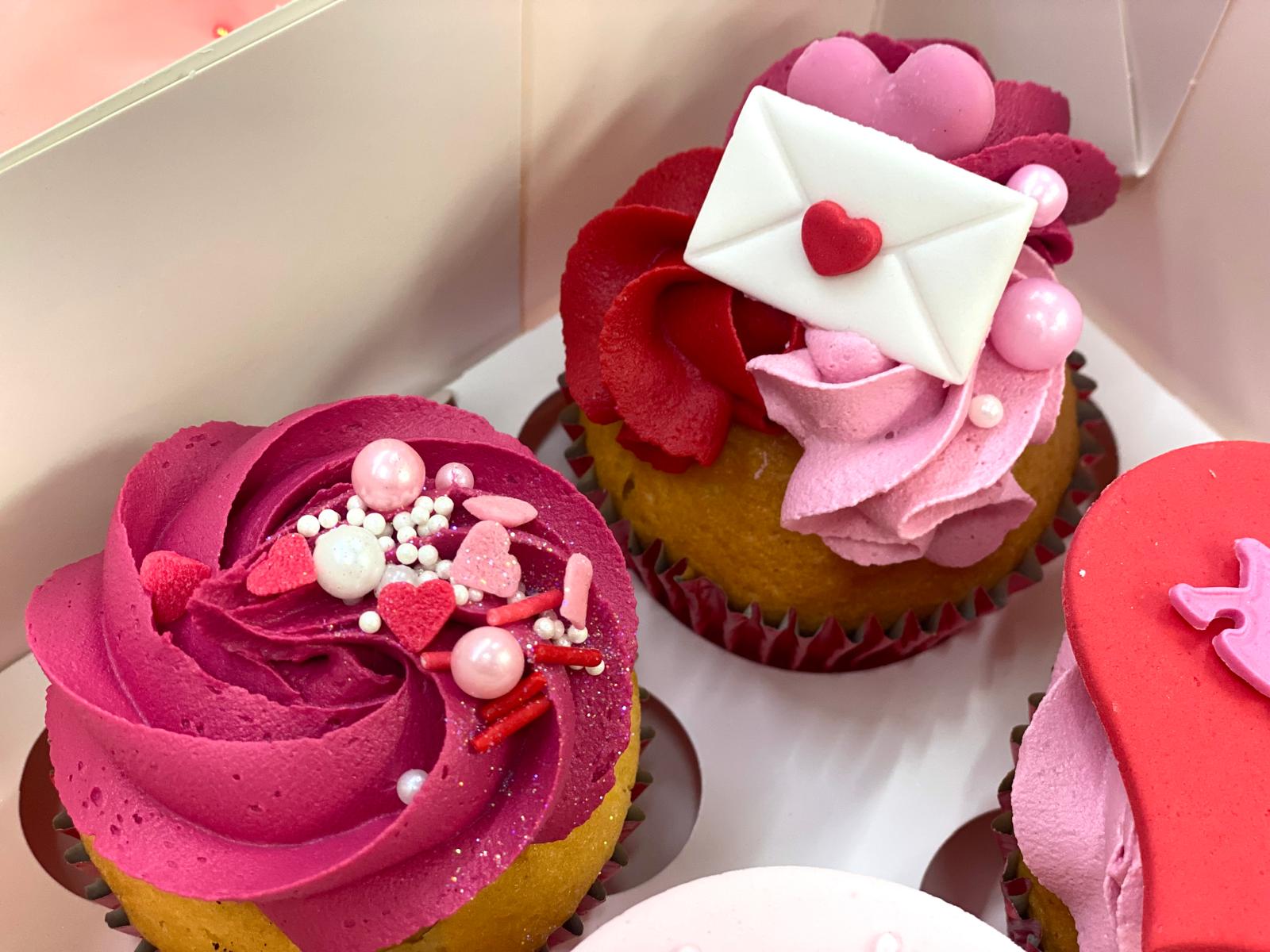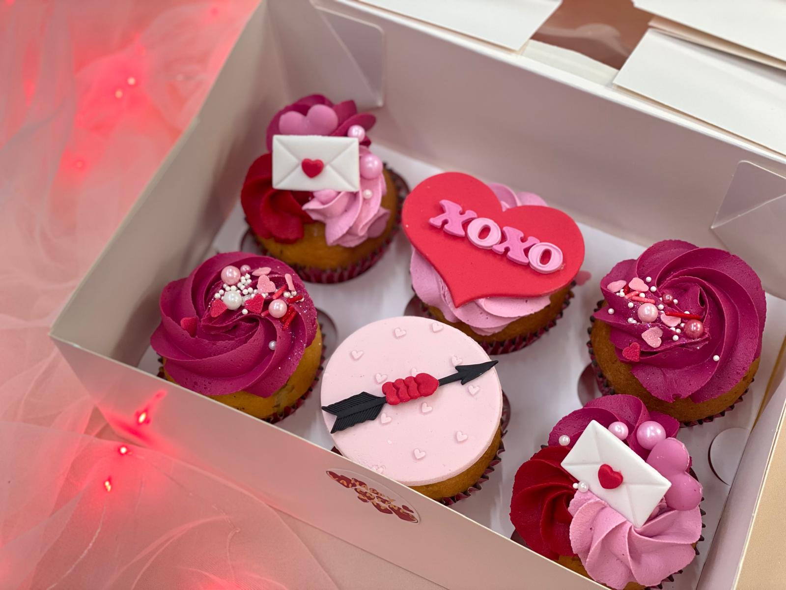 Our signature vanilla and chocolate cupcakes decorated with handmade fondant icing and delicious vanilla buttercream in a sweet valentines theme. Each set of 6 contains 2 chocolate cupcakes and 4 vanilla cupcakes.