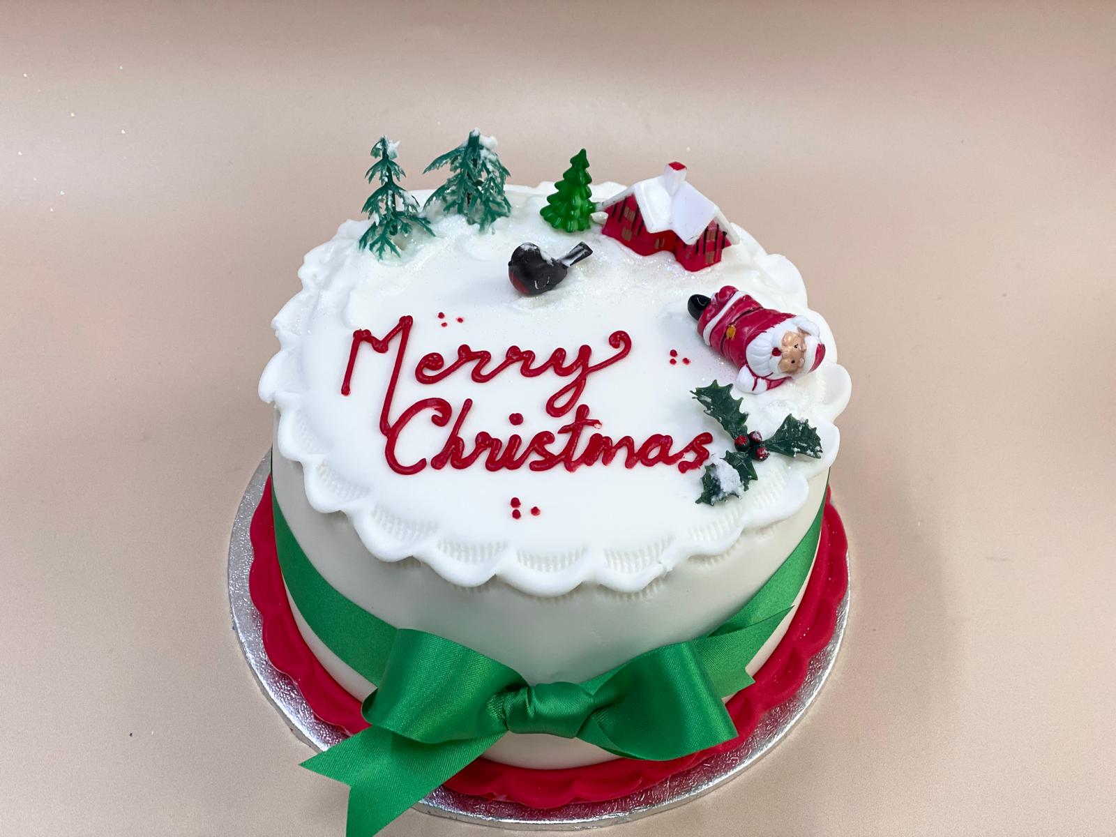 Our signature Victoria sponge Christmas themed cake is available to order in multiple sizes. Decorations may vary slightly to picture depending on stock availability.  If a bigger size is needed please give us a call on 02083033777